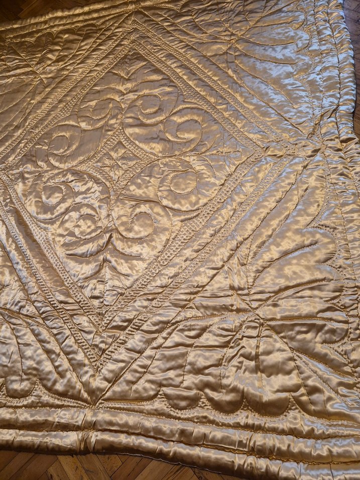 Çeyizlik yorgan işlemeli desenleri ve parlak altın rengiyle şık bir görünüm sunar. Yumuşak ve pürüzsüz dokuludur. ️
