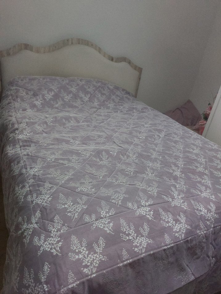Pastel mor renkte, beyaz işlemeli çiçek desenleriyle süslenmiş tül üzeri. ic tarafı gayet yumuşak daha önce hiç kullanmadım. sadece fotoğrafını çekmek için yatağa serdim ev hediyesi gelmişti yatak ortum olduğu icin kullanmadım