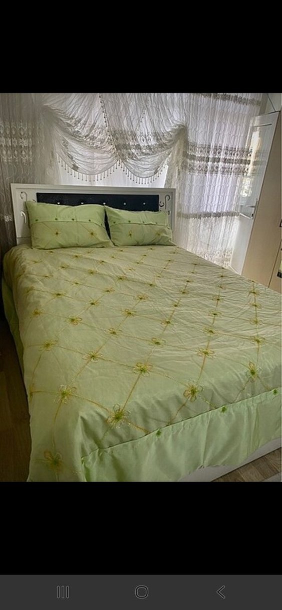 Pastel yeşil tonlarında, zarif işlemeli çiçek desenlerine sahip yumuşak ve şık yatak örtüsü. Yeni sıfır hiç kullanılmamış