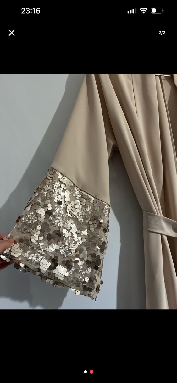 Bej renkli, uzun ve bol kesim sabahlık, parlak işlemeli payet detaylarıyla strappy kollara sahip, çağdaş ve göz alıcı bir tasarım sunar. ✨