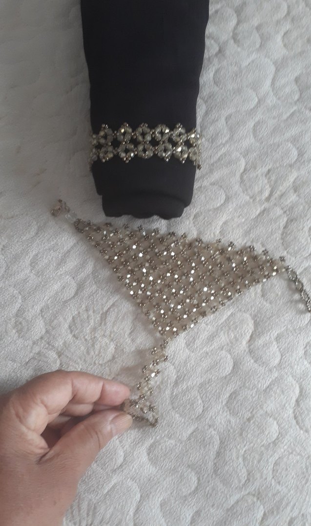 İşlemeli ve payetli kadın el zinciri, canlı gri ve beyaz tonlarda bohem ve avangart bir tarz sunar, düğünler için uygundur.