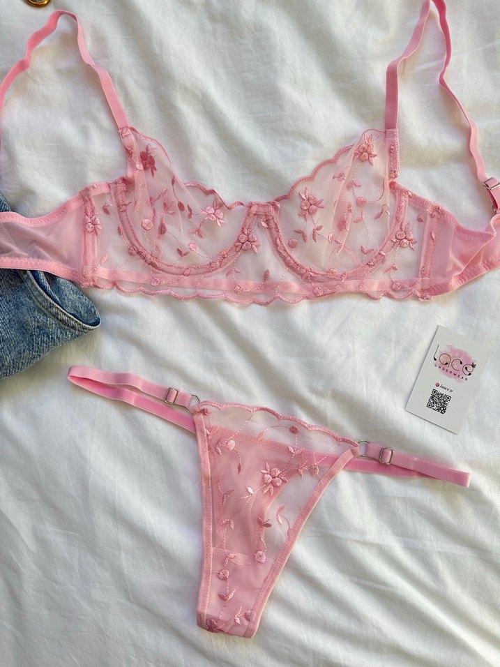 Pastel pembe renkli, işlemeli çiçek detaylı, ayarlanabilir askılı bohem Paris tarzı sütyen ve külot takımı.