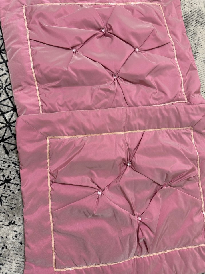 Parlak görünümlü, işlemeli detaylara sahip pembe yatak örtüsü, düğmeli yastıklı bölümleriyle dokulu bir tasarım sunar.