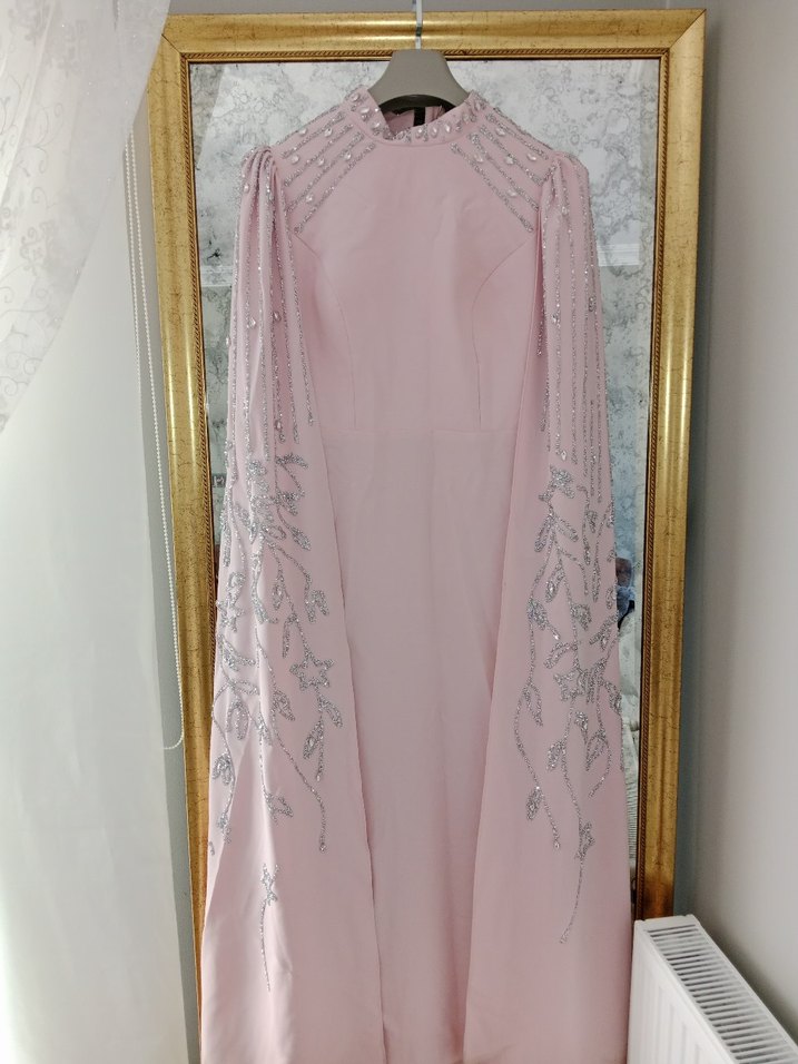 Bu pastel pembe uzun abiye elbise, işlemeli detaylar ve drape tasarımıyla dikkat çeker. Straplez yakalı ve normal kesimdir, düğünler için uygundur.
