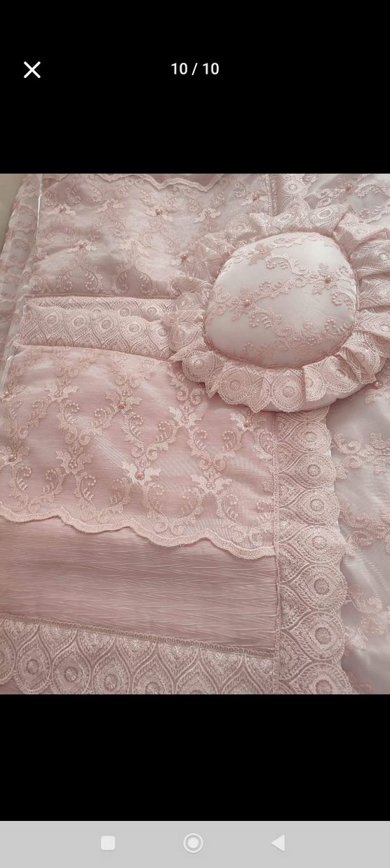 Pastel pembe renkli, işlemeli desenlere ve dantel detaylara sahip yatak örtüsü, uyumlu yuvarlak yastık ile birlikte.