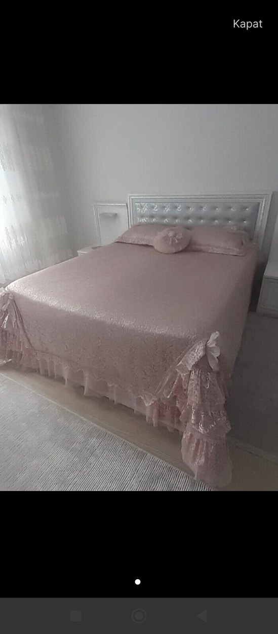 Pastel pembe renkte, işlemeli desenlere ve fırfırlı kenarlara sahip yumuşak ve şık yatak örtüsü.