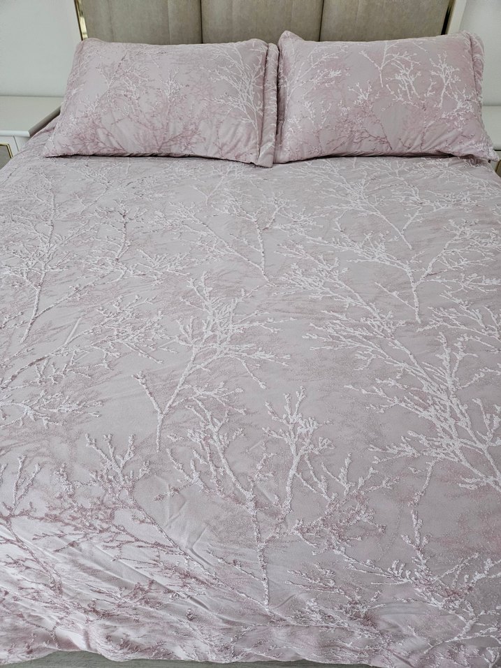 Pastel pembesi renginde, zarif işlemeli desenlere sahip yatak örtüsü, yatak odanıza yumuşak ve şık bir dokunuş katıyor.