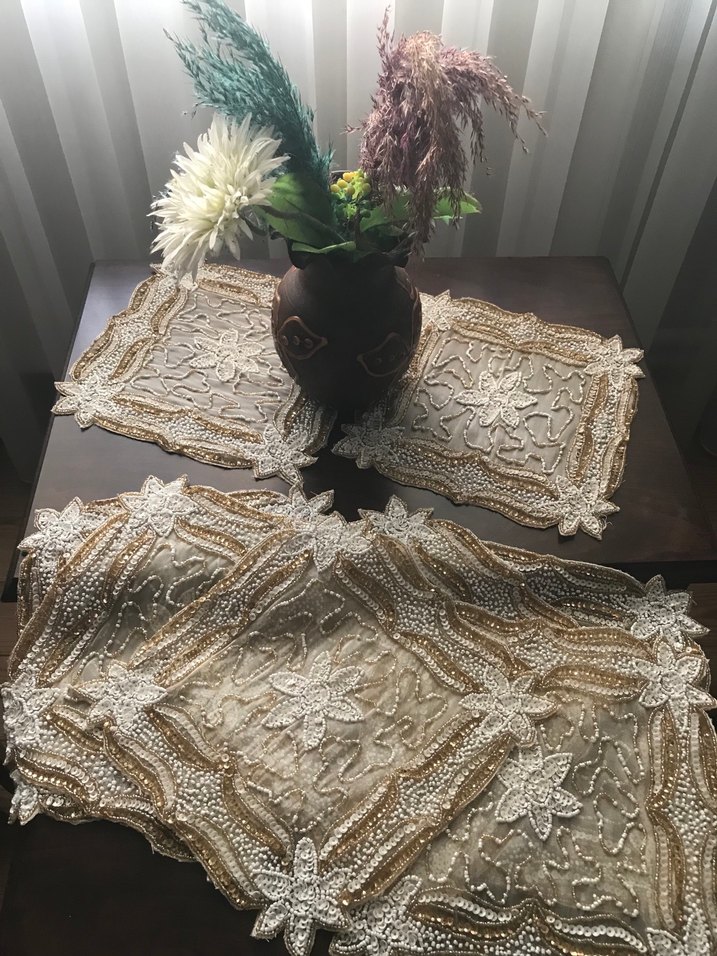 Bohem tarzda, çiçek desenli işlemeler ve boncuk detaylarıyla süslenmiş masa örtüsü seti, masanıza zarif bir dokunuş katıyor.