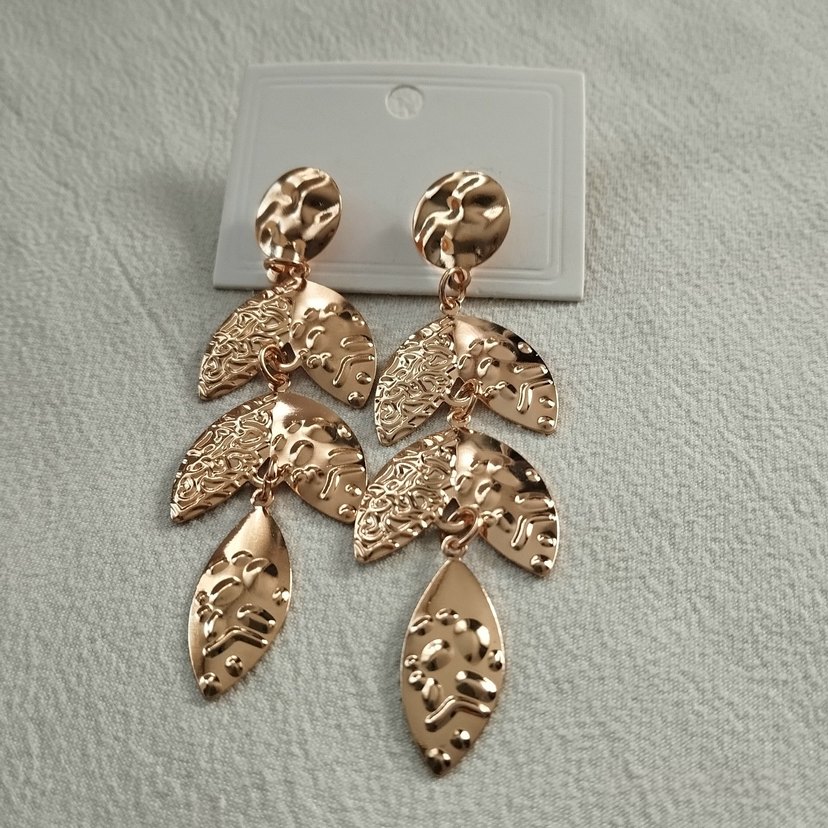 İşlemeli yaprak desenleri ve püskül detaylarıyla uzun küpeler, parlak yüzeyiyle şık ve gösterişli, düğünler için uygun. ✨