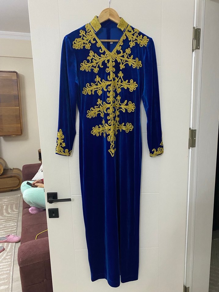 İşlemeli desenlerle süslenmiş, saks mavisi, ipeksi kumaştan, uzun kollu ve yakalı, düğünler için uygun dar kesim elbise.
