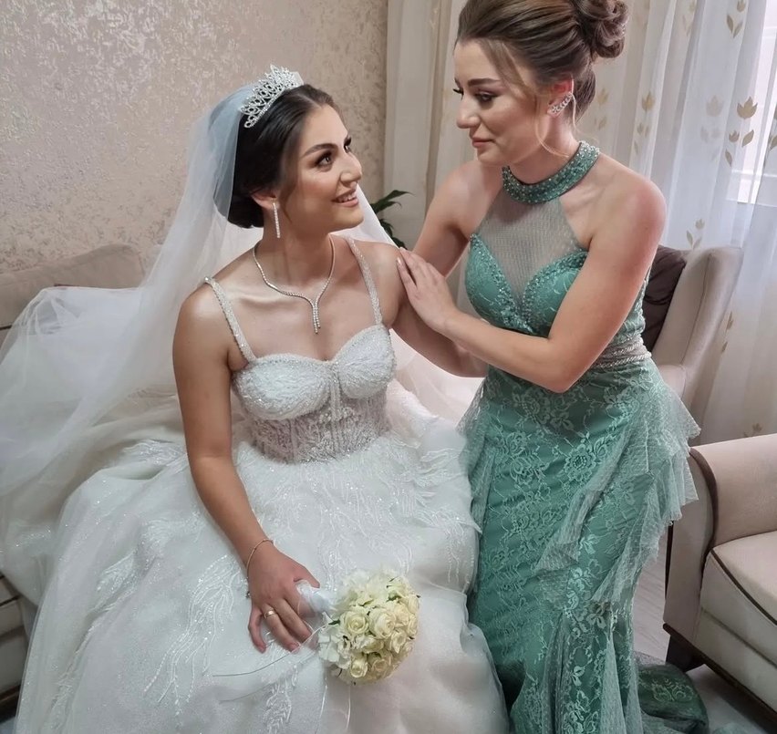 Askılı, dantel ve taş işlemeli gelinlik. Tarlatanı ile birlikte verilecektir. 36-38 beden arasındaki kişilere olur. Sırtı hafif açık çapraz askılıdır. Taç ve duak hediyedir.