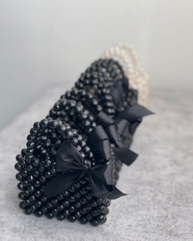 Siyah boncuklarla işlenmiş, örgü kumaştan yapılmış, fiyonk detaylı kadın çantası. Gotik ve klasik zarafeti bir arada sunar. nikah şekeri olarak ta satılır