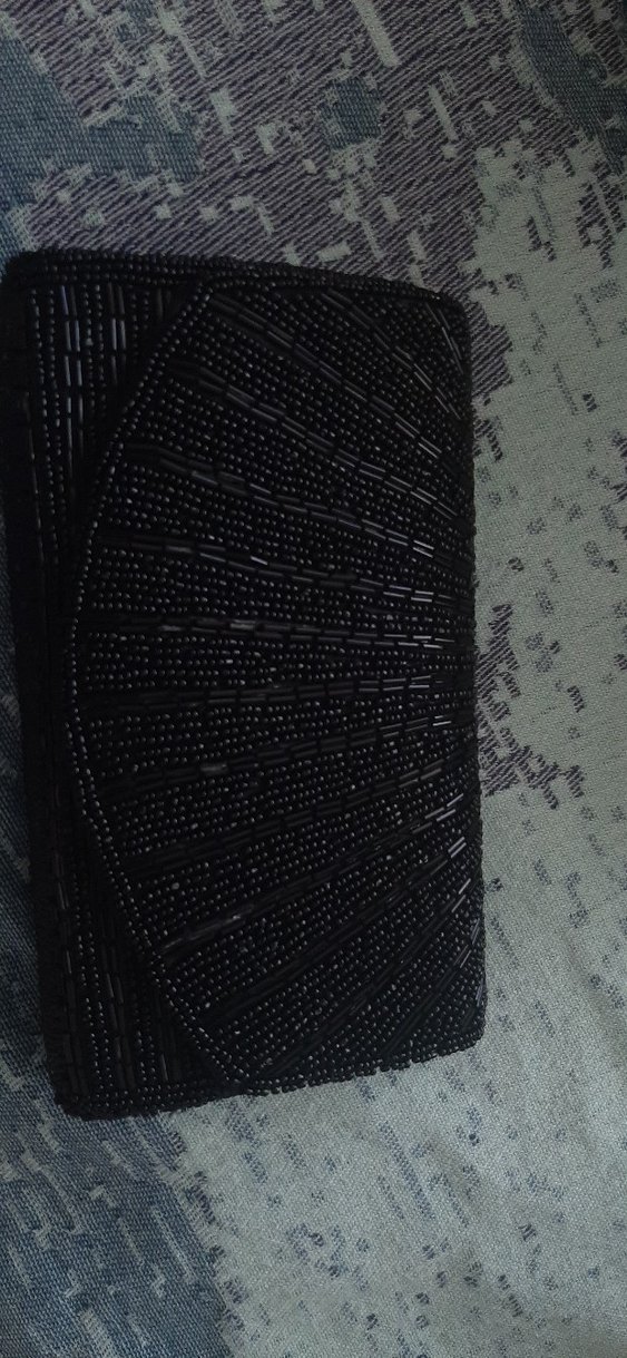 Siyah renkte, sentetik kumaştan yapılmış, işlemeli ve boncuklu detaylara sahip vintage goth tarzında kadın clutch çanta.