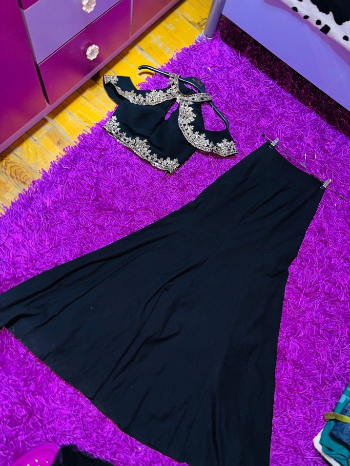 Bu siyah mini elbise, tekne yaka ve kolsuz tasarımı ile işlemeli boncuk detaylara sahiptir, düğünler için uygundur.