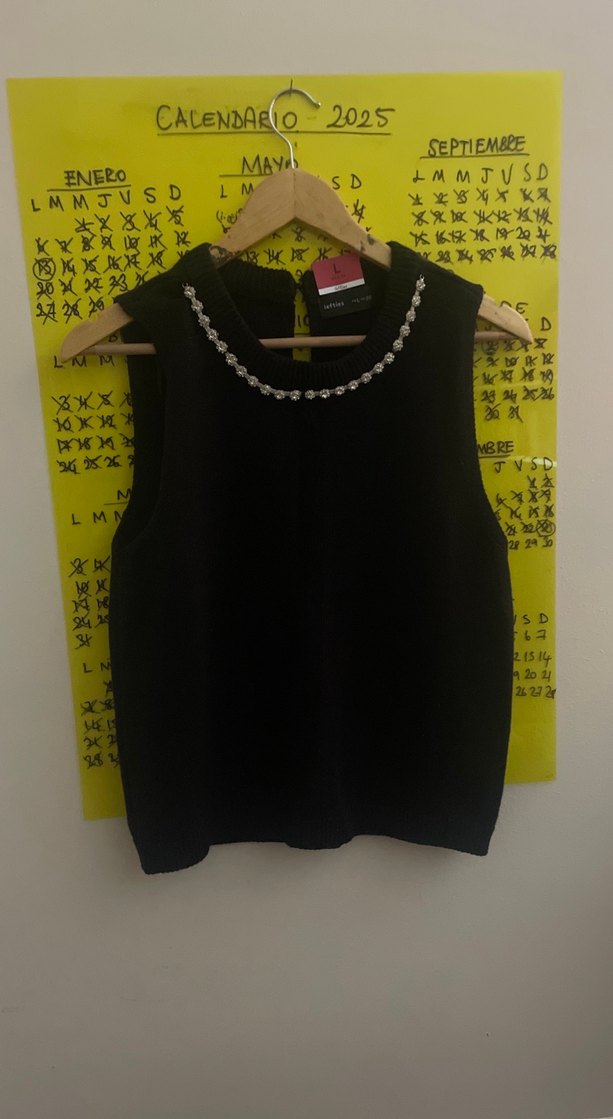 Yüksek yakalı, kolsuz, siyah örme yelek, yakasında boncuk işlemeleriyle trend ve şık bir görünüm sunar.