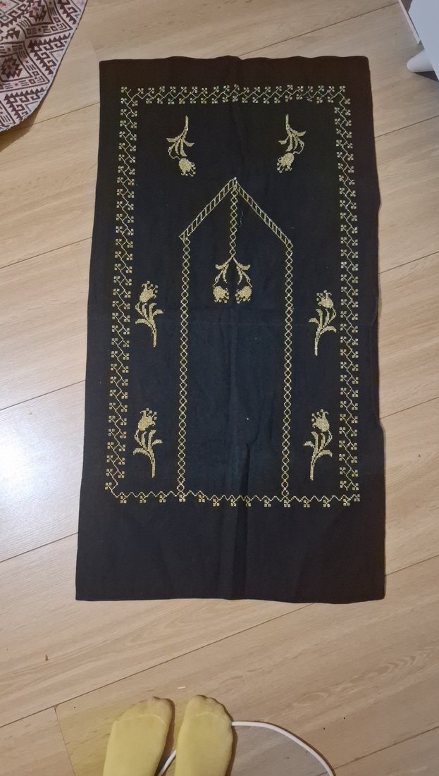 Altın sarısı işlemelerle süslenmiş siyah seccade, çiçek ve geometrik desenler içerir. kahve rengi seccade ikili fiyatıdır.