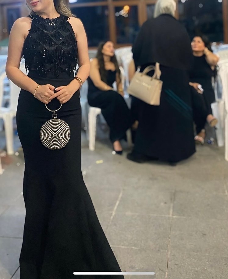 Fitted kesim, yüksek yakalı ve kolsuz siyah uzun abiye elbise. Parlak boncuk işlemeleriyle, düğünler için gotik tarzda şık bir seçenek. ✨