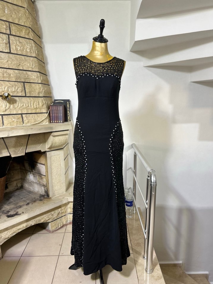 İşlemeli detaylara ve boncuk süslemelere sahip, v yaka ve kolsuz, siyah uzun kadın abiye elbise. Gotik tarzda düğünler için uygun. 34-36-38 bedenler için uygundur.
