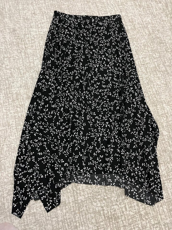 Siyah midi etek, işlemeli beyaz desenler ve dökümlü tasarıma sahip, sentetik kumaştan üretilmiştir. Gevşek kesimiyle dış mekan kullanımı için uygundur.
