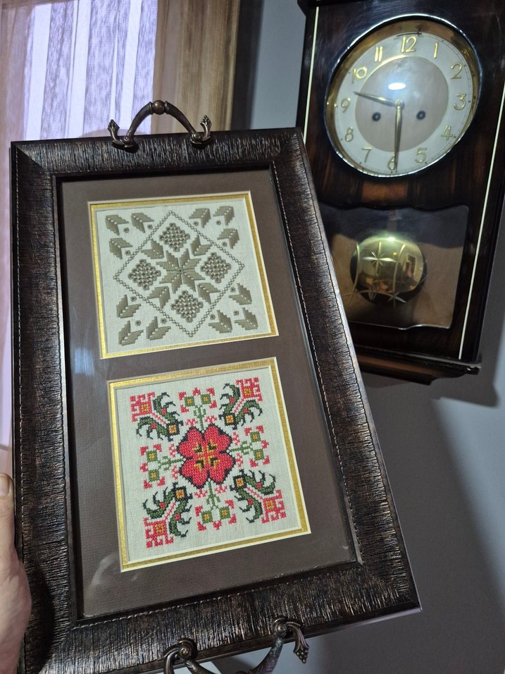 Kahverengi çerçevede, biri nötr tonlarda diğeri canlı renklerde iki nakış deseni bulunuyor. ️