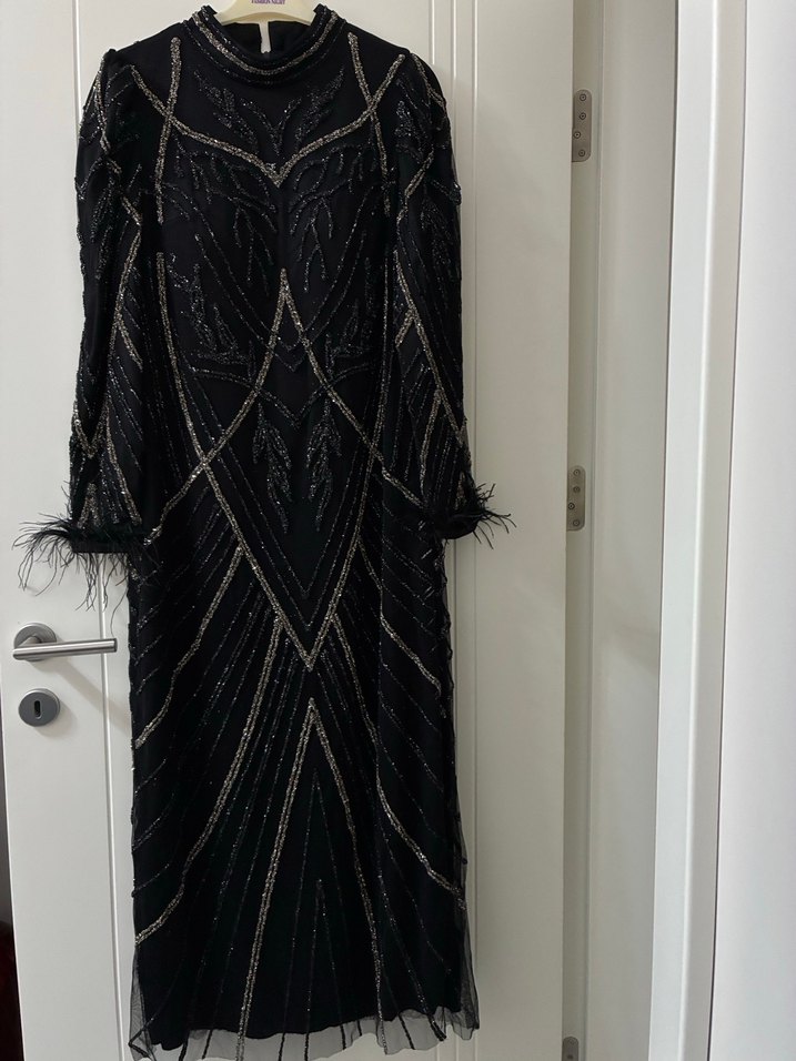 Yüksek yakalı, işlemeli ve tüy detaylı kollu tesettür abiye. Hiçbir sorunu yok. İli koltuk altı arası 60 cm