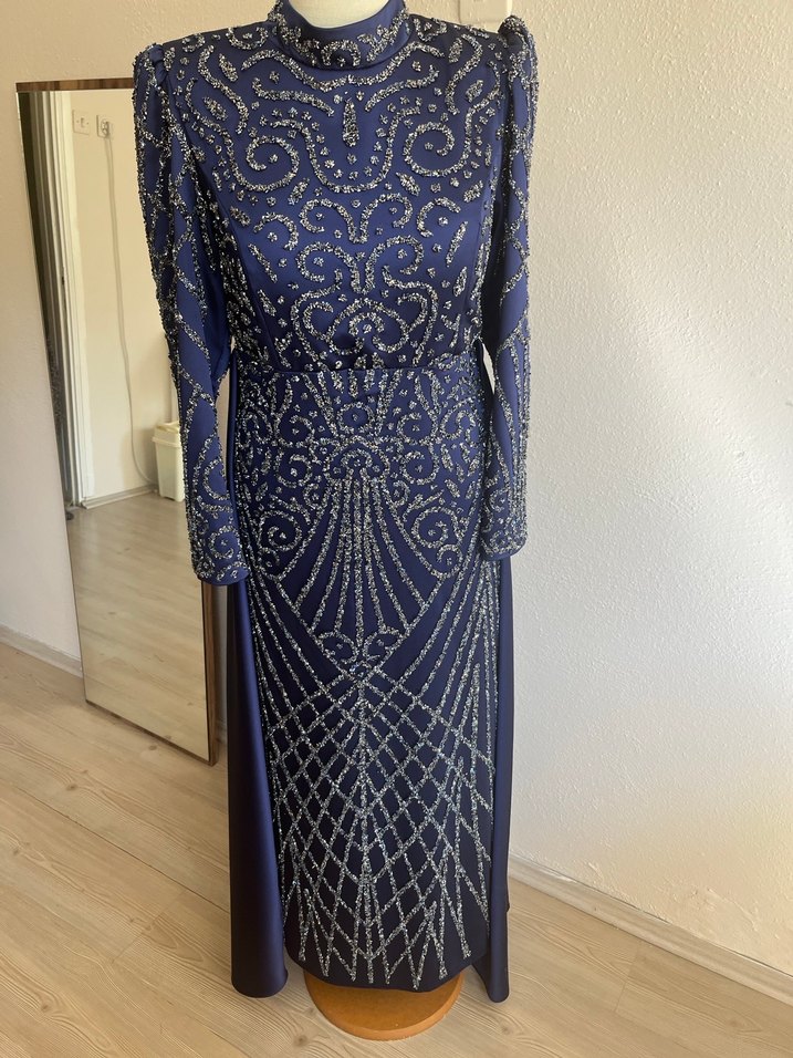 Navy renginde, uzun kollu ve yüksek yakalı abiye elbise. Parlak boncuk işlemeleriyle süslenmiş, klasik ve vintage tarzda, düzenli kesimle sunulur.