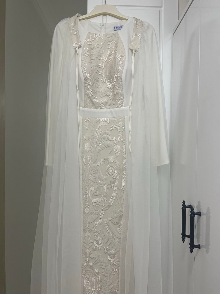 1 kez kullanıldı.Balık model.abiye gelinlik nikah elbisesi olarak kullanılabilir Esnek rahat bir kumaş.55 kiloya kadar olur. Göğüs çevresi:90cm bel çevresi:72cm basen:90cm boy:145cm. İçi astarlıdır göğüs pedi vardır.işlemeli desenlere sahiptir. Drapeli üstü ile modern klasik ve bohem tarzı bir arada sunar.