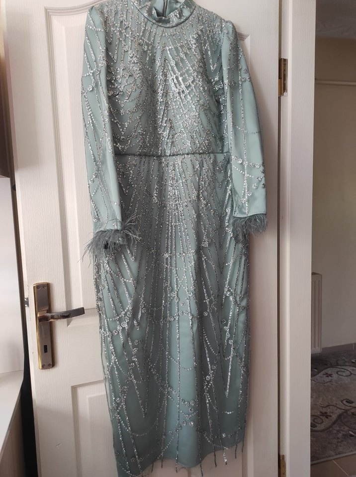 rengi fotograftaki gibi boyu 140 bedeni 46 bedendir. arka pelerinide vardır.şal ve bonesi hediye olarak gönderilecektie
