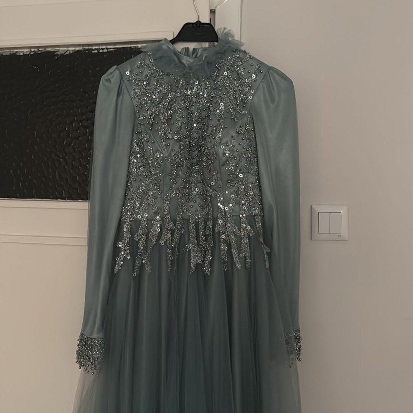 İşlemeli Uzun Kollu Gri Abiye Elbise