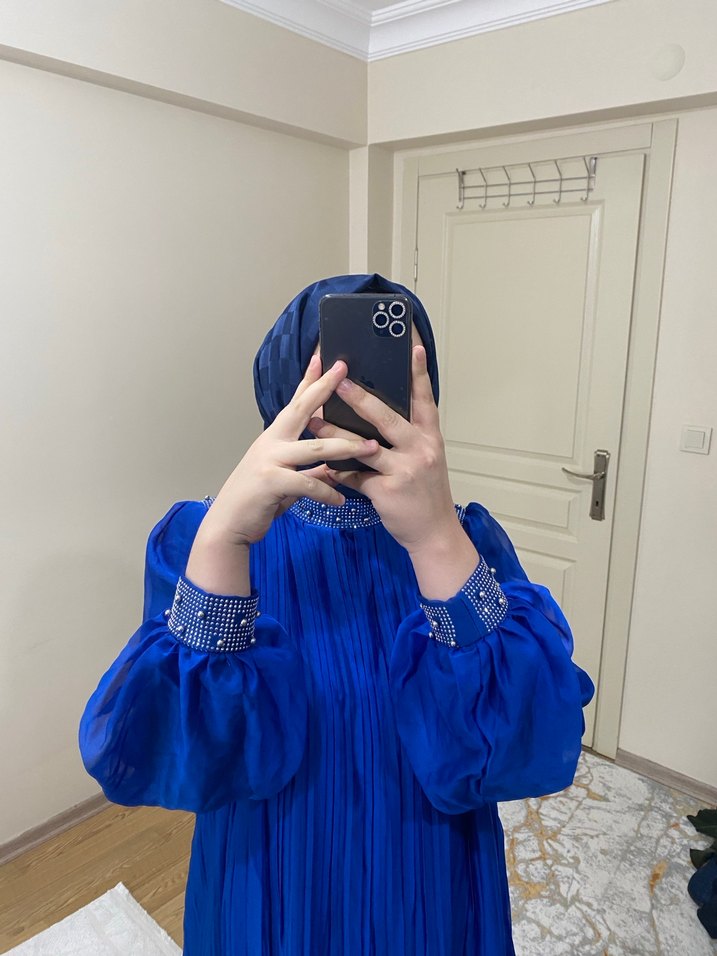 İşlemeli, uzun kollu, yüksek yakalı ve bol kesimli mavi elbise. İpek gibi kumaştan, drapeli ve bohem tarzda, günlük kullanıma uygun. ✨