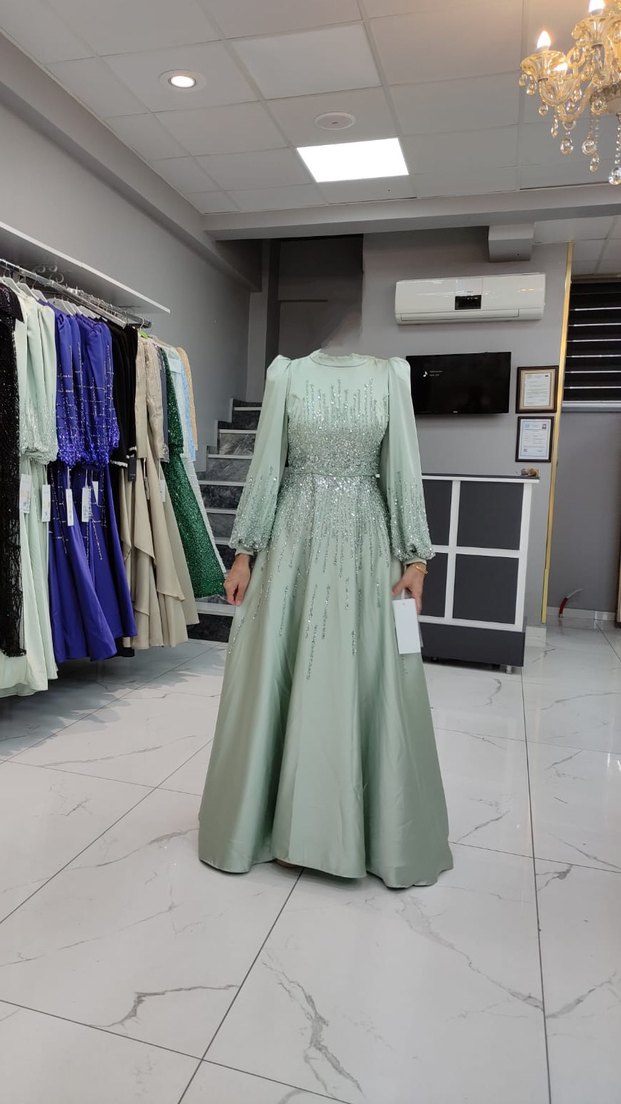 Uzun kollu, yuvarlak yaka ve işlemeli detaylara sahip açık yeşil uzun abiye elbise. Dökümlü, regular fit kesimiyle modern klasik tarzda, düğün için uygun. Şal dahildir . #abiye #tesettürabiye #satenelbise #yeşilabiye #elbise