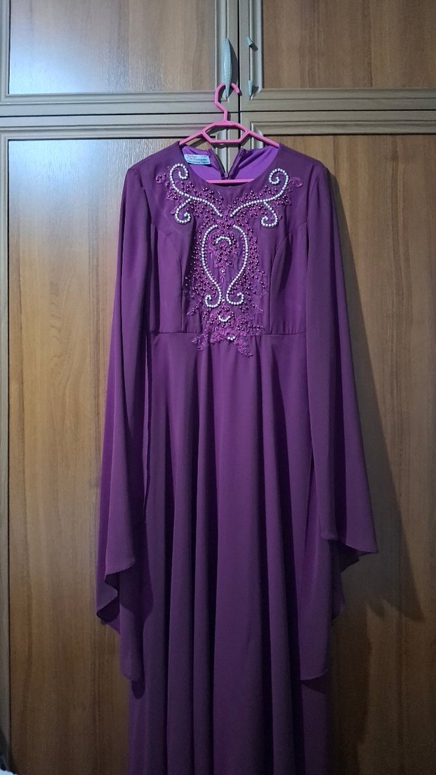 Drapeli uzun kollu mor abiye elbise, V yaka ve işlemeli detaylara sahip. Bol kesimli, mütevazı ve bohem tarzda, düğün için uygun. 38-44 beden aralığında olur sadece bir kere kullanıldı hiç bir DEFORMESİ yok