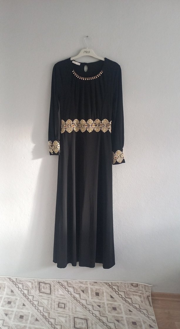 İpek gibi kumaştan, uzun kollu ve yuvarlak yakalı bu siyah elbise, bele, kollara ve yakaya işlenmiş boncuklu işlemelerle süslenmiştir. Vintage ve mütevazı tarzda, düğünlere uygundur. uzunluğu 1.40 iki koltuk altı 42 kumaşa likralı'dır