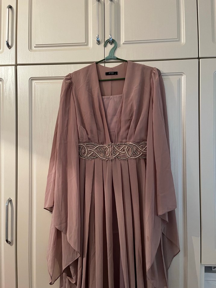 Uzun, bol kesim, drapeli elbise; ince askılı ve işlemeli kemer detaylıdır. V yakalı, yumuşak pastel bej renkte, düğünler için uygundur.