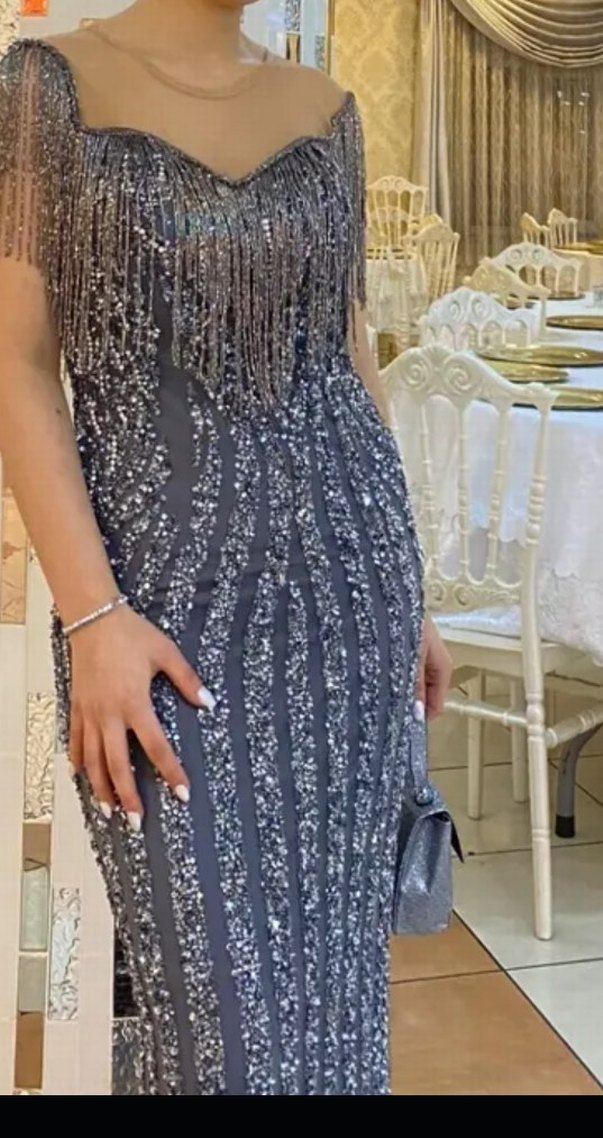 Gri renk işlemeli ve boncuk detaylı, V yaka ve kolsuz uzun, vücuda oturan abiye elbise. Parlak ve gösterişli tasarım, 1 defa giyilmiştir ister istemez dökülme olmuştur çoğunlukla kollarınsa olmuştur o yüzden bu fiyata koyuyorum yoksa bu fiyata değil çünkü taşların hepsi el işleme ile işlenmiştir.✨