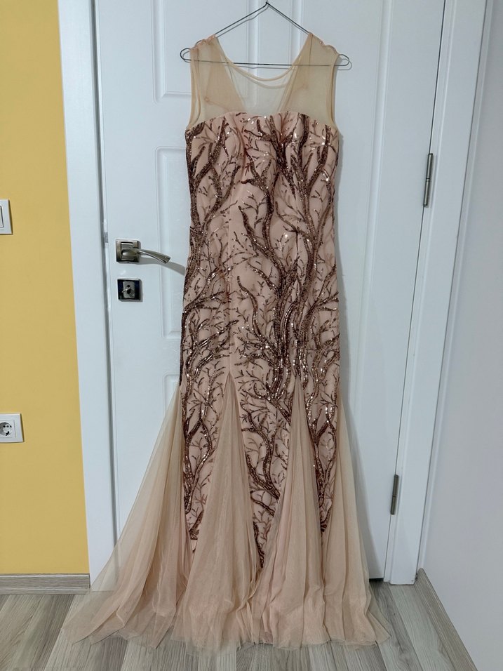 Drapeli ve v yaka detaylı, işlemeli uzun abiye elbise. Bej parlak kumaş ve dar kesimle şık bir görünüm sunar.