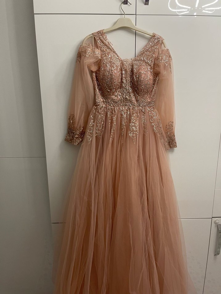 İşlemeli V Yaka Uzun Kollu Bej Nişan Elbisesi