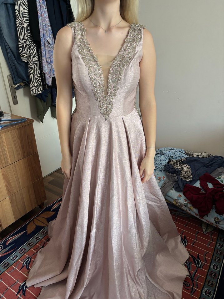 Kolsuz, v yaka ve işlemeli detaylı, pudra renkli, uzun ve drapeli abiye elbise. Modern klasik tarzda, parlak kumaştan yapılmıştır. Sadece bir kez kullanıldı önündeki tül detayı görseldeki gibi çıkartılabiliyor herhangi bir sorunu yok.