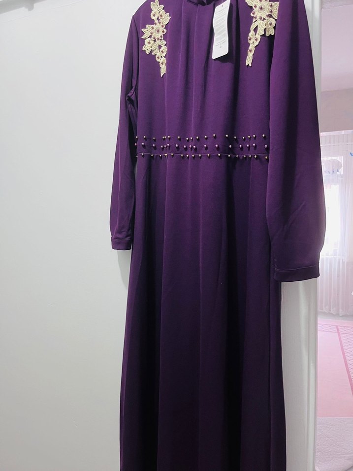 Yüksek yakalı, uzun kollu, bol kesim mor uzun elbise. Omuzlarda işlemeli desenler ve belde boncuk detayları bulunur. İpeksi, parlak kumaştan.