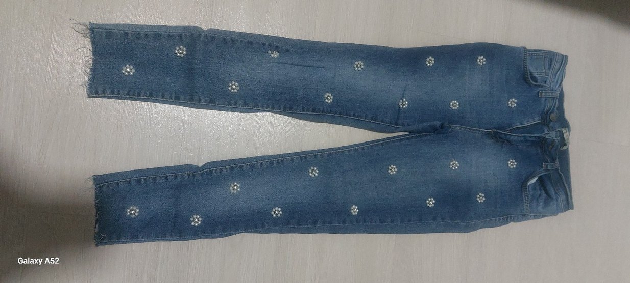 İşlemeli çiçek desenleri ve boncuklarla süslenmiş, normal midi boy, mavi renk, dar kesim kadın jean pantolon, günlük rahat kullanıma uygun.