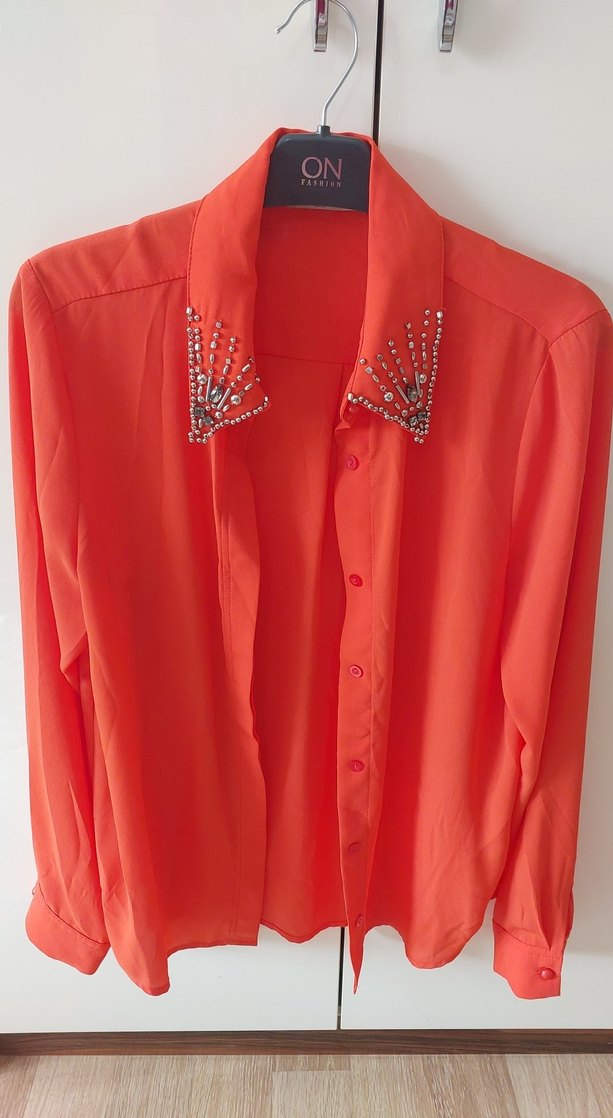 İşlemeli yakalı, düğmeli kırmızı kadın gömleği. İpek gibi dokusu, uzun kollu ve bol kesim. Ofis kullanımı için uygundur.