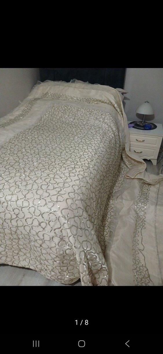 İşlemeli desenli ve parlak beyaz kumaştan yapılmış yatak örtüsü, odaya zarif bir dokunuş katıyor. ✨so. fotoda ölçüleri ve bazı ayrıntılar mevcuttur