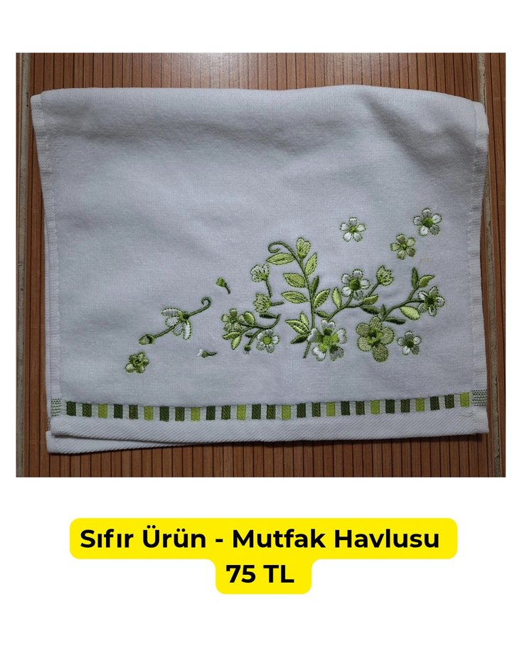 Yeşil işlemeli çiçek detaylı, bohem tarzda, yumuşak gri zemin ve çizgili #mutfakhavlusu