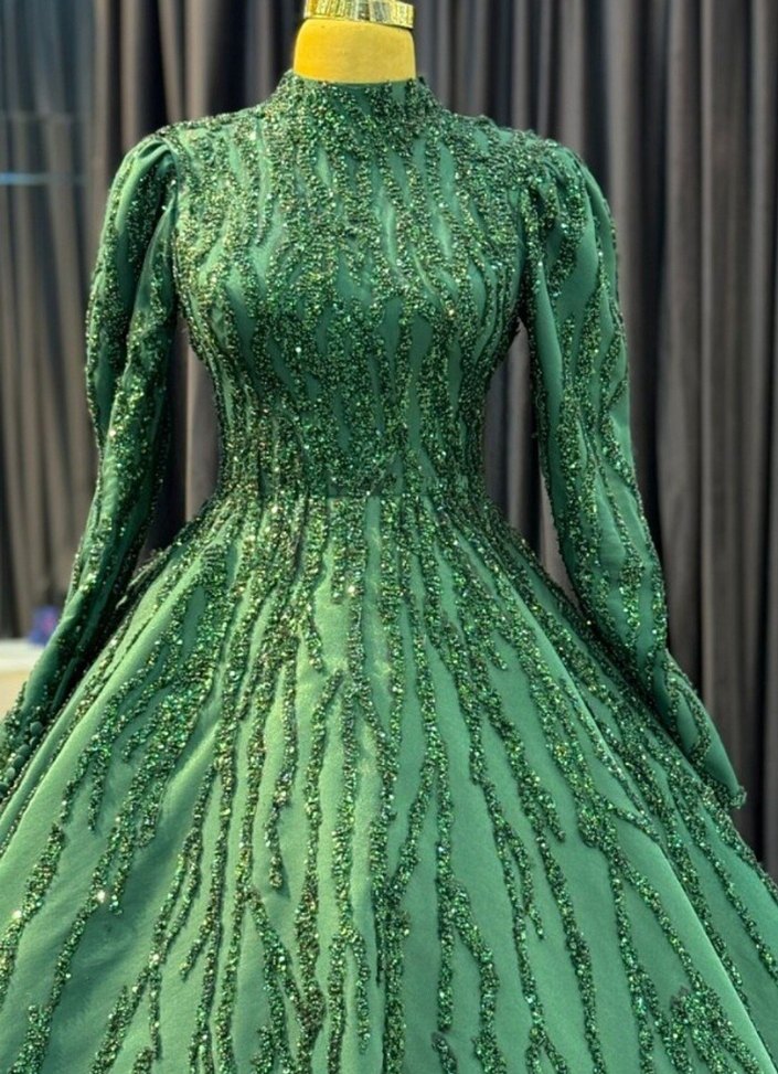 Yeşil, uzun kollu ve yüksek yakalı bu abiye elbise, işlemeleriyle klasik ve zarif bir görünüm sunar. Düğünler için uygundur. Kina ve nişanlık olarak kullanilabilir✨