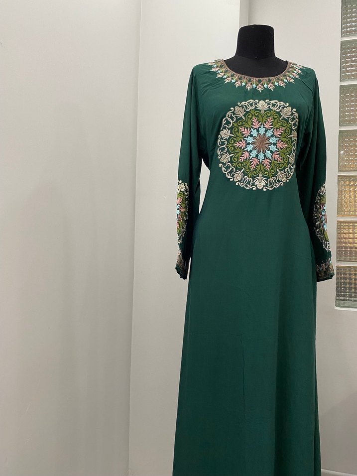 Nakış detaylı, renkli işlemelere sahip yeşil uzun elbise, bol kesim, yuvarlak yaka ve uzun kolludur. Pamuk viskon kumaştan üretilmiştir.