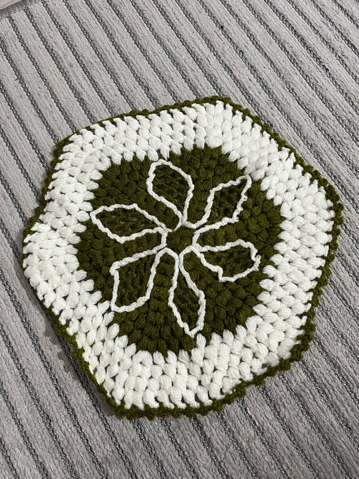 Yeşil ve beyaz renklerde, işlemeli desenlere sahip yumuşak dokulu banyo paspası. Gri zemin üzerinde yer almaktadır.