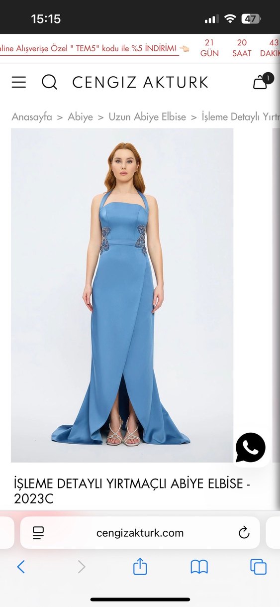 Açık mavi uzun abiye elbise, straplez yakalı ve askılıdır. İşlemeli detayları ve yırtmaçlı drapeli tasarımıyla düğünler için klasik ve çağdaş bir şıklık sunar.
