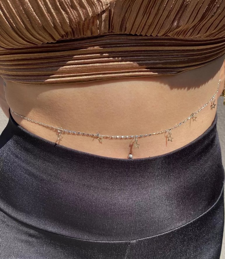 İşlemeli yıldız detaylı, zincir detaylı altın renkli bel zinciri. Günlük sokak stiline uygun, parlak ve cesur tasarım. ✨