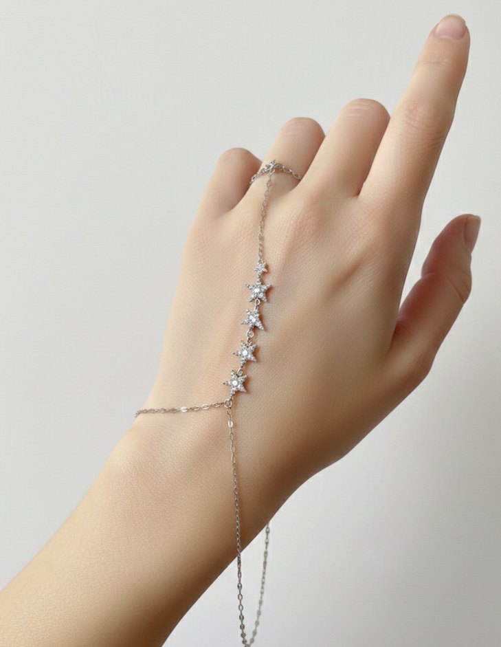 İşlemeli detaylara sahip beyaz el zinciri, çağdaş ve minimalist tasarımıyla düğün ve şık günlük kullanıma uygundur.