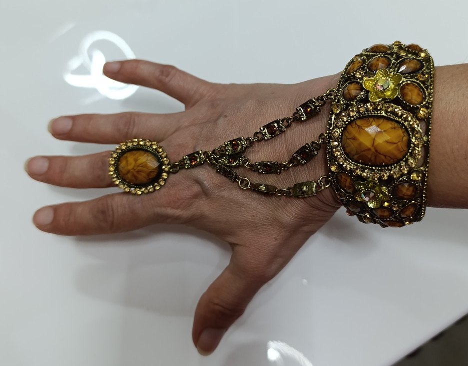 Bohem tarzda, işlemeli desenli ve zincir detaylı koyu altın renkli bileklik, düğünler için uygundur. ✨